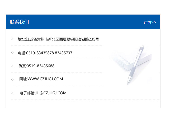 地址:常州市新北區友邦商務大廈1幢16、17層  電話:0519-85101652  傳真:0519-85112595  郵編:213022  網址:www.cz-jiayue_cn.hzkejin.com  郵箱:xiajifengaa@163.com